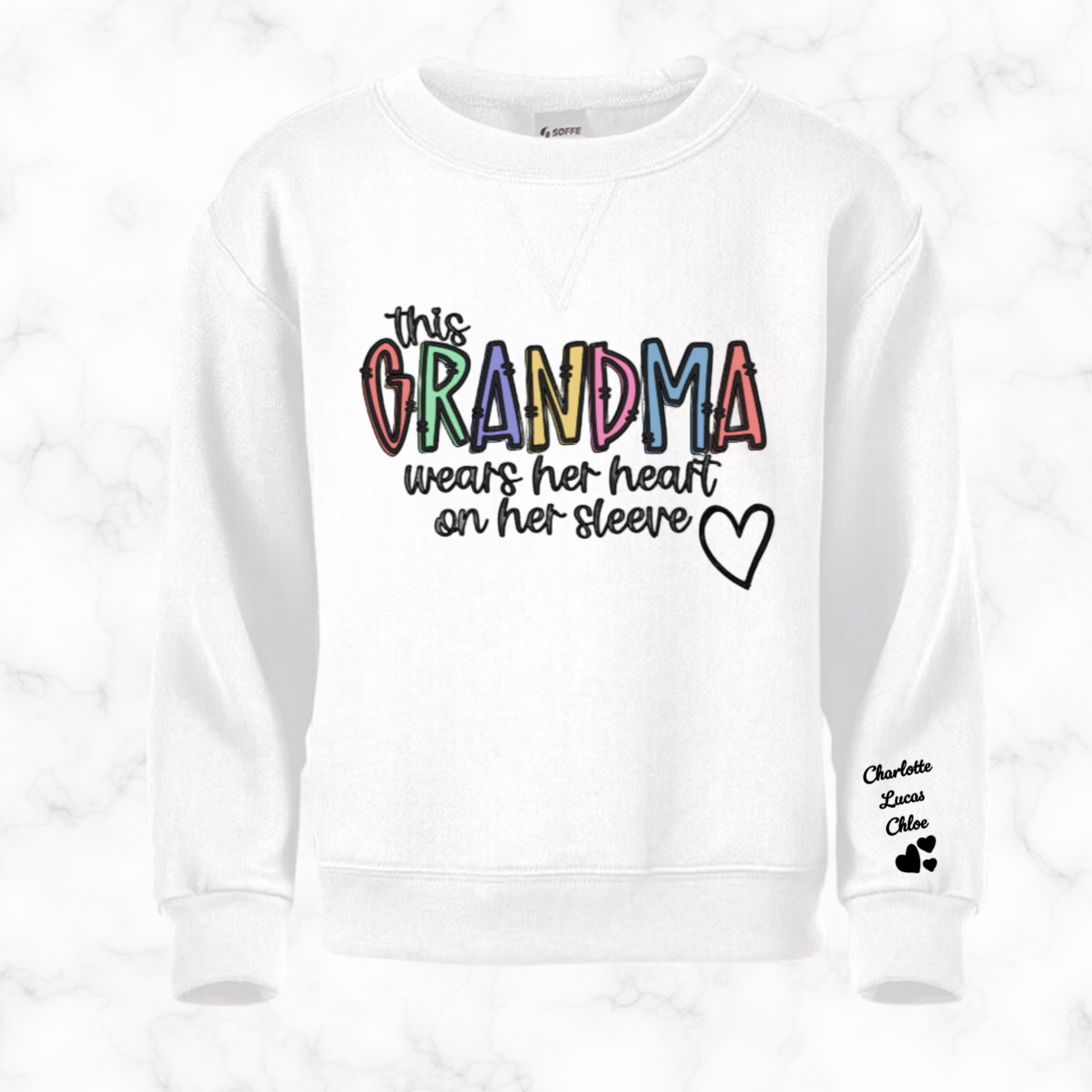 Show off your love for your grandkids with our personalized sweatshirt! The perfect gift for any grandparent, this sweatshirt features the names of your beloved grandchildren on the sleeve. Stay warm and stylish while proudly displaying your love for your family. Order yours now!